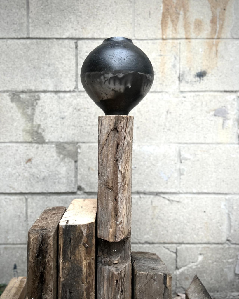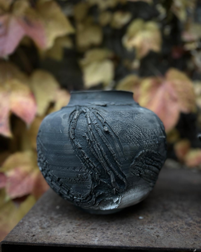 The series of Raku vessels was finished with a specialized food-safe sealant. Traditionally, Raku pieces are porous and decorative, but Thomas’s approach bridges the functional and the expressive. “These pieces are extremely unique,” he explains. “They retain the tactile surface of smoke firing but can also be used safely. Each one is unique and will never be replicated.”